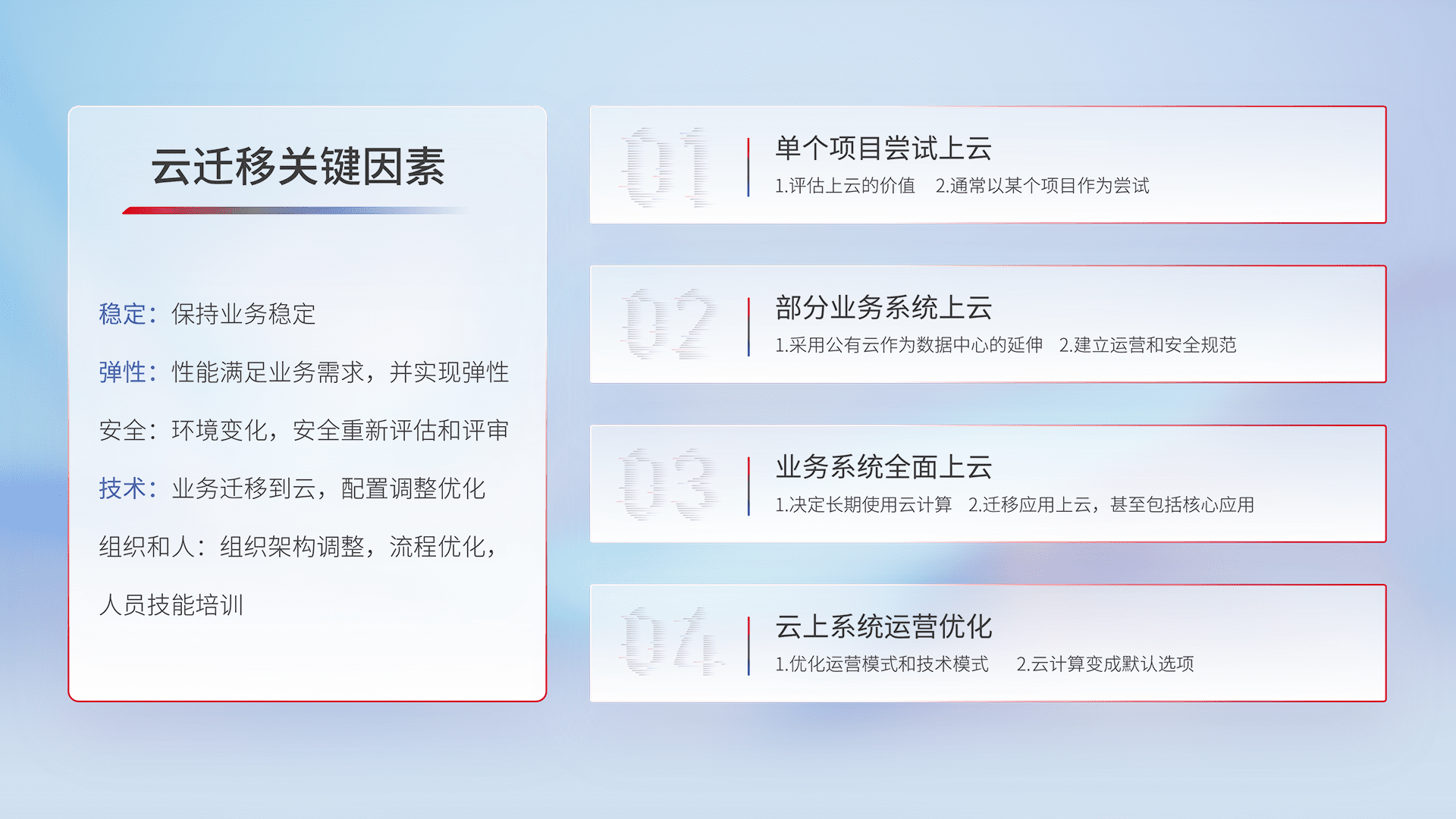 结合实际业务,,,从规划设计、、、、云平台选型、、、云原生改造、、、、数据迁移、、集成交付,,迁移全过程为客户识别最佳上云路径,,做好风险识别管理,,设计网络架构、、身份权限、、安全审计合规、、、、操作审计、、、、日志审计、、、监控告警策略、、多站点容灾设计等,,,对云上基础设施进行整体规划,,,,提升IT治理水平,,,,以满足弹性、、、高可用、、、、高性能的需求。。。